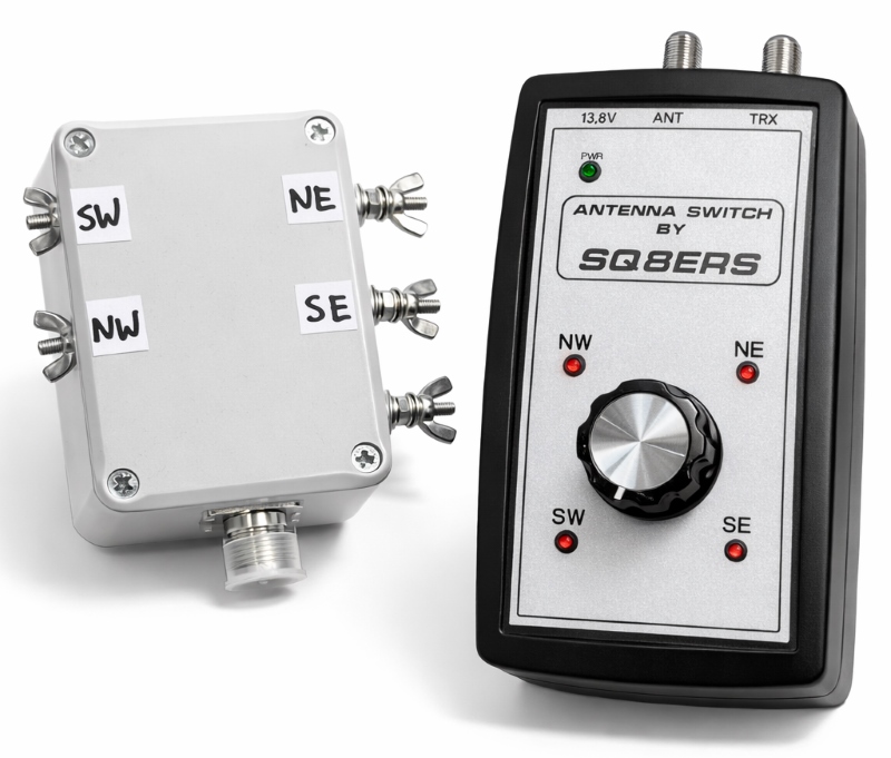 Powstał nowy sterownik do anteny, oraz nowy układ przełączania kierunków. W tej wersji anteny nie potrzeba dodatkowych kabli sterujących, komunikacja i zasilanie jest po kablu koncentrycznym! Antena współpracuje ze sterownikiem z przyciskami oraz nowym na enkoderze. Dodatkowym atutem jest możliwość rozbudowania pojedynczej anteny do systemu czterech anten 4SQ. Tak wygląda nowa wersja.