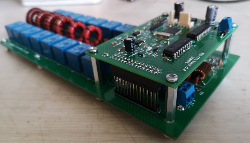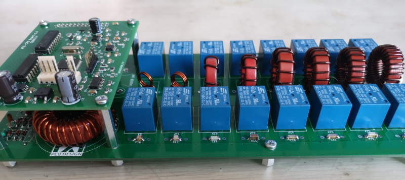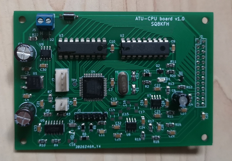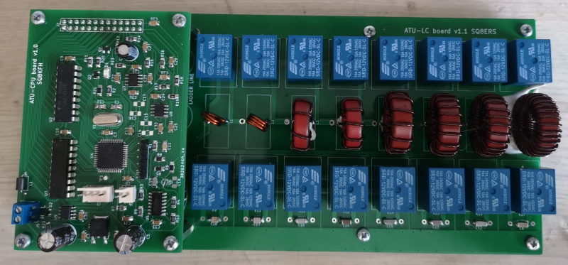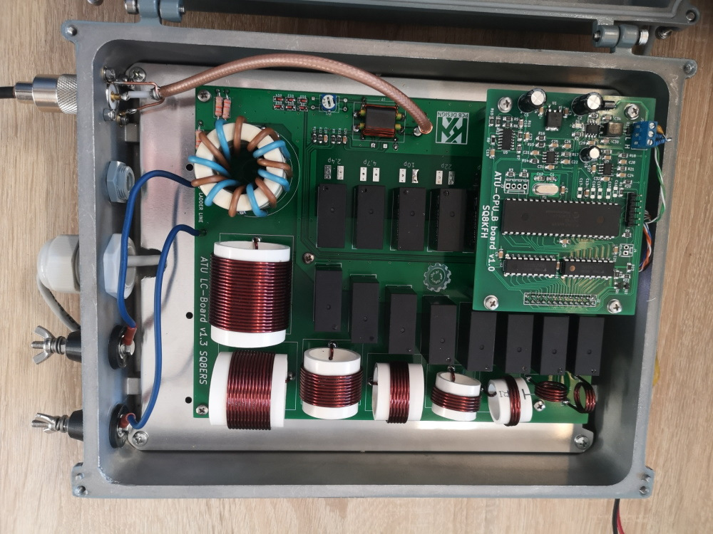 Górna płytka z procesorem to sterownik do skrzynki. Obsługuje wszystkie przekaźniki, odczytuje pomiary z mostka, cewek do pomiaru prądu i częstotliwość. Na płycie jest dodatkowe złącze do obsługi wyświetlacza LCD i złącze do przycisku TUNE. Kolejne złącze obsługuje komunikacje z zewnętrznym sterownikiem.